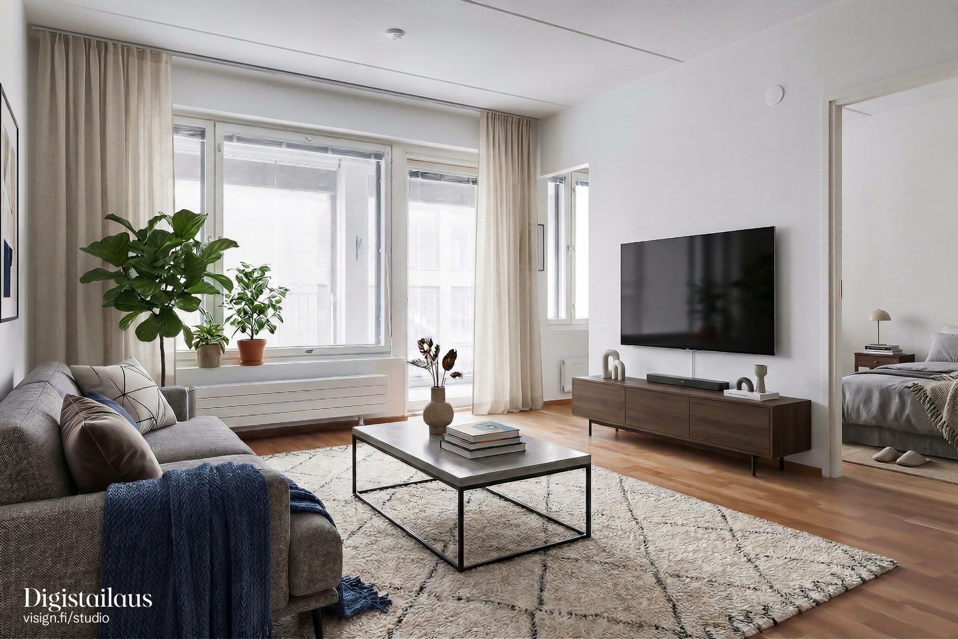 Asuntoon on valittu tyylikkäät ja laadukkaat pintamateriaalit jo rakennusvaiheessa. Samalla alkuperäistä pohjaratkaisua on muutettu panostamalla isoon olohuoneeseen jättäen yksi makuuhuoneista toteuttamatta. Se on kuitenkin helppo rakentaa jälkeenpäin ikkunajaon tukiessa asiaa.